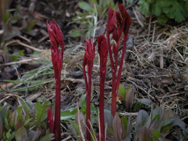 roter Blattaustrieb einer rosafarbenen Pfingstrose